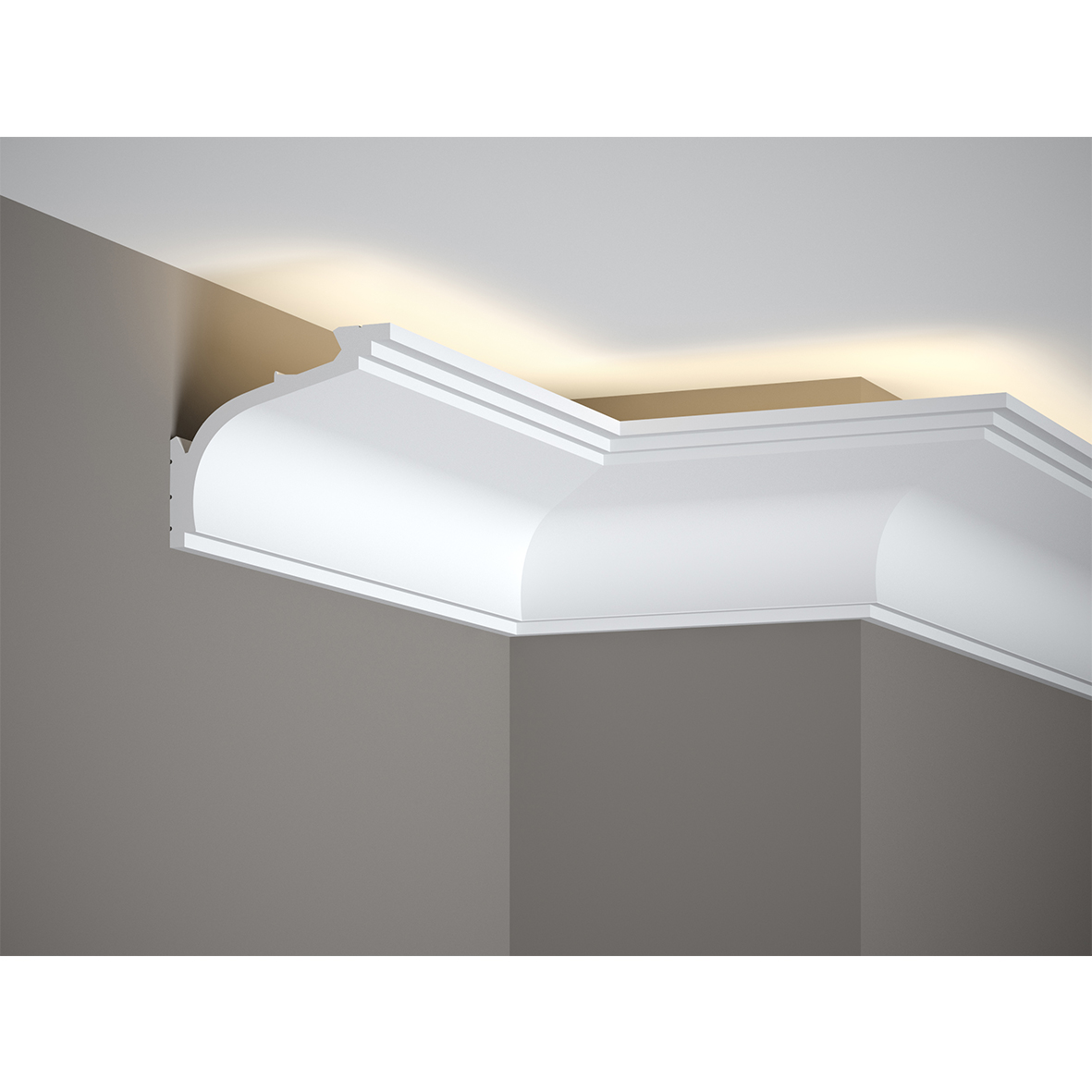 Cornișa pentru tavan este un profil finisat cu mici decorațiuni de frezare în partea de sus și de jos. Aceasta este realizată folosind tehnologia ScratchShield®. Este rezistentă la apă și UV. Dispune de tehnologia LightGuard® pentru o instalare ușoară a unei benzi LED.